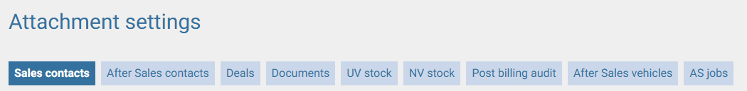 Each attachment is linked to a section (e.g.: Sales Contacts, After-Sales Contacts, Deals, etc.).